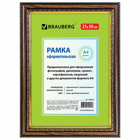 Рамка 21х30 см, пластик, багет 30 мм, BRAUBERG "HIT4", орех с двойной позолотой, стекло, 390994